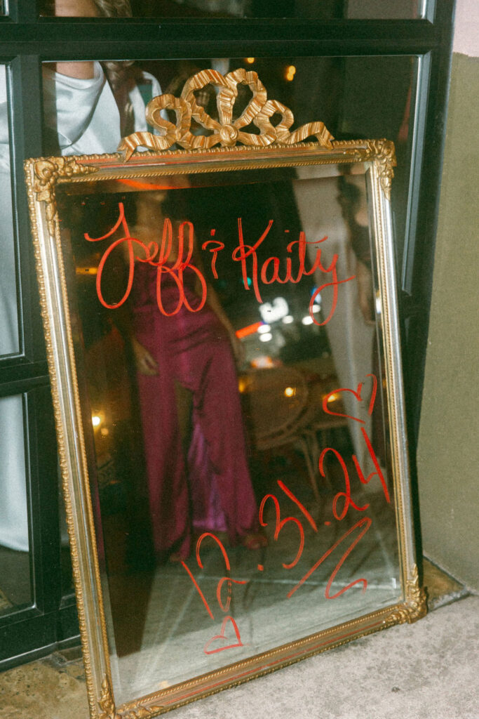 This couple poured their heart and soul into planning every detail of their big day. Not only did the venue align perfectly with their trendy, playful vibe, but their celebration was packed with stylish touches that will inspire 2026 weddings. Jeff’s hand-tied ribbon is a trend I foresee becoming more popular in the coming year. Sheet cakes like the one they shared at their reception are another trend I expect to grow. The pops of red throughout the ceremony and reception will undoubtedly make this wedding unforgettable. Did you see Kaity’s bold lipstick and the handwritten mirror signs? Iconic!